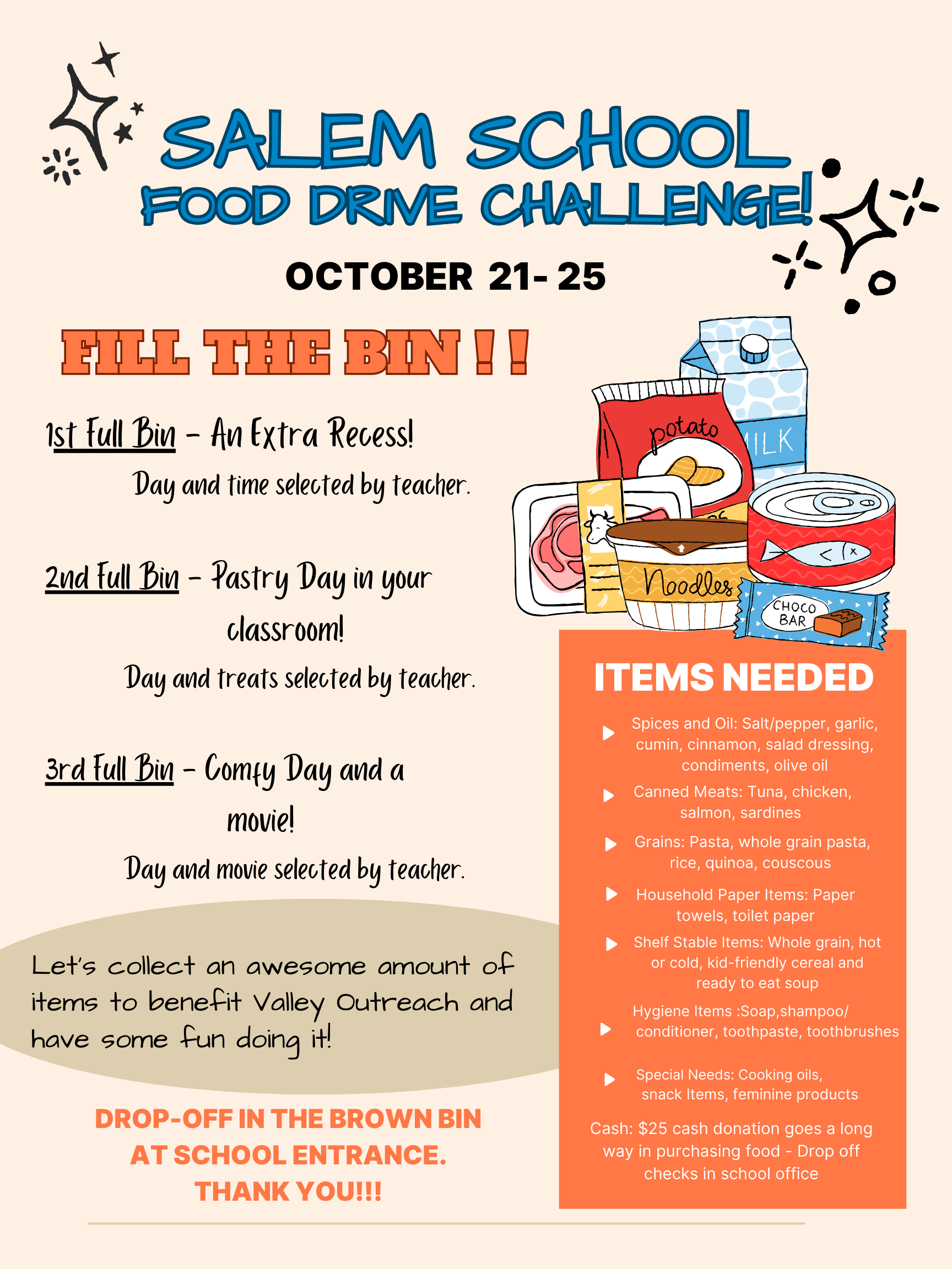 Our students will have the opportunity to shine their lights and help Valley Outreach, a local non-profit that provides food, clothing, and support for people who need help. Please bring as many items as you are willing throughout next week and place them in the brown bin at the school door entrance. We will have a little fun and challenge the kids to FILL THE BIN!