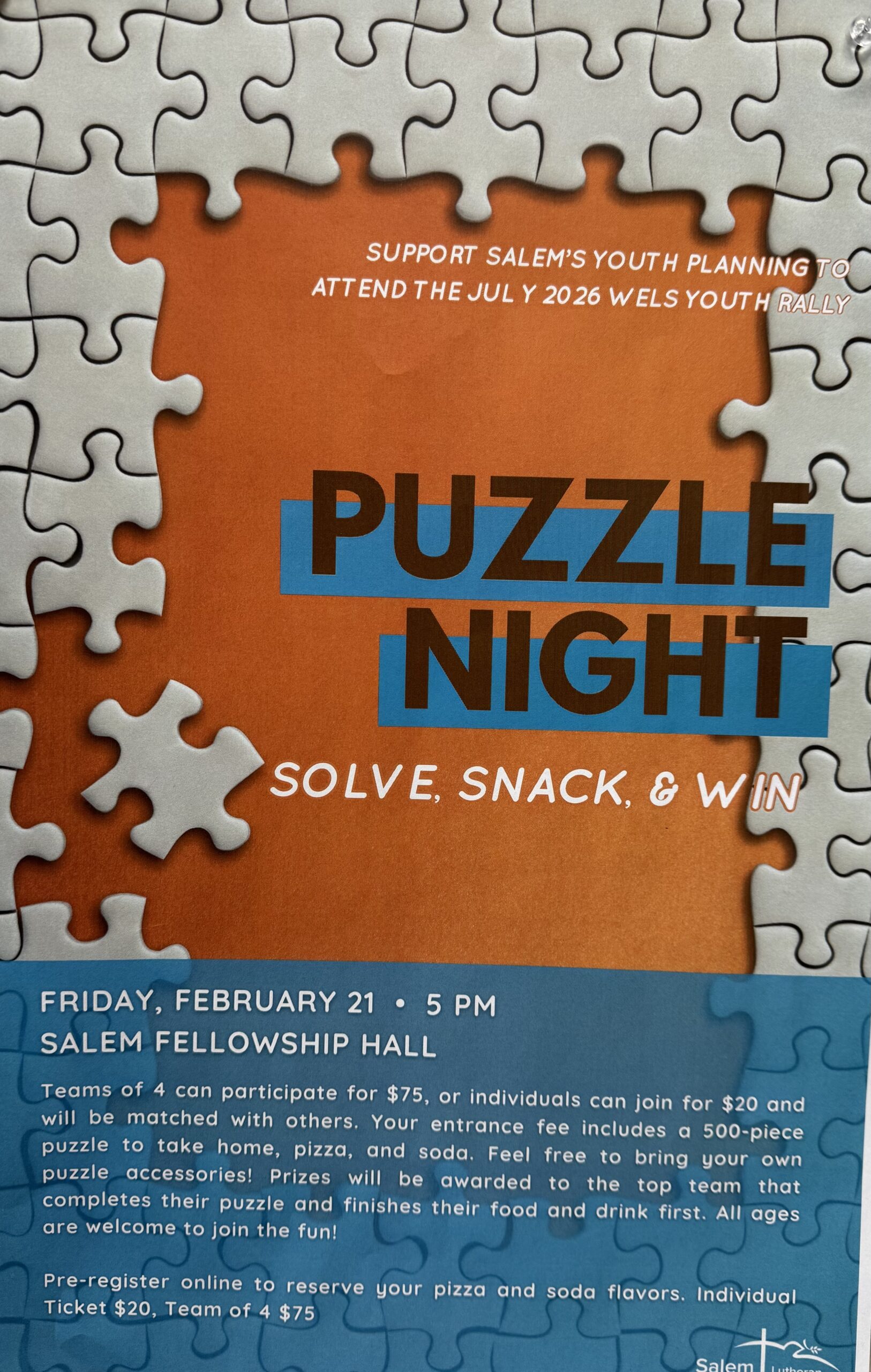 Are you looking for a fun night out with friends this Friday? Salem is hosting a Puzzle Night! Check out this attachment for more information and go to www.salemlutheran.org to sign up.